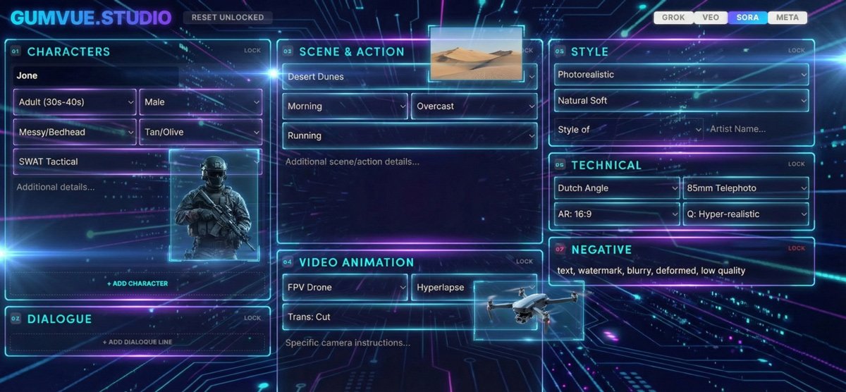 Control every element: camera, lenses, lighting, mood, pacing, color, framing, and storytelling — down to each cinematic beat.